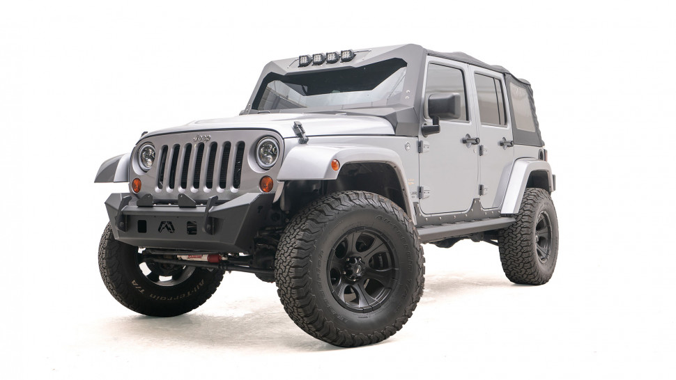 New For the Jeep JK the Fab Fours Stubby bumper was engineered with the Jeep purist in mind. Key features include ultra narrow design (to provide maximum tire clearance), Winch Ready (with included winch plate), Integrated D-rings and tow hooks, and integrated fog light housings (3X3 Pod lights or **factory fogs**) This bumper has tapered edges and the Fab Fours knife edge design but is no wider than the grill. The bumper is manufactured out of all 3/16 steel and is fully welded inside and out for superior strength and durability all matched with the best price point in the Industry. Available with or without Guard.