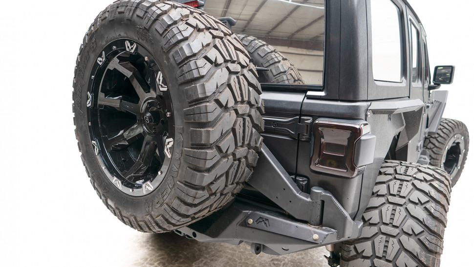 Matched with our exclusive Jeep JL Rear Bumper, the Fab Fours JL Tire Carrier adds superior strength, utility, and 100% function of your back-up camera with the help of our new injection molded camera shroud. This off-the-door tire carrier is the first ever “5-point system” for the JL, allowing ease of opening and shutting while running up to a 40″ tire.