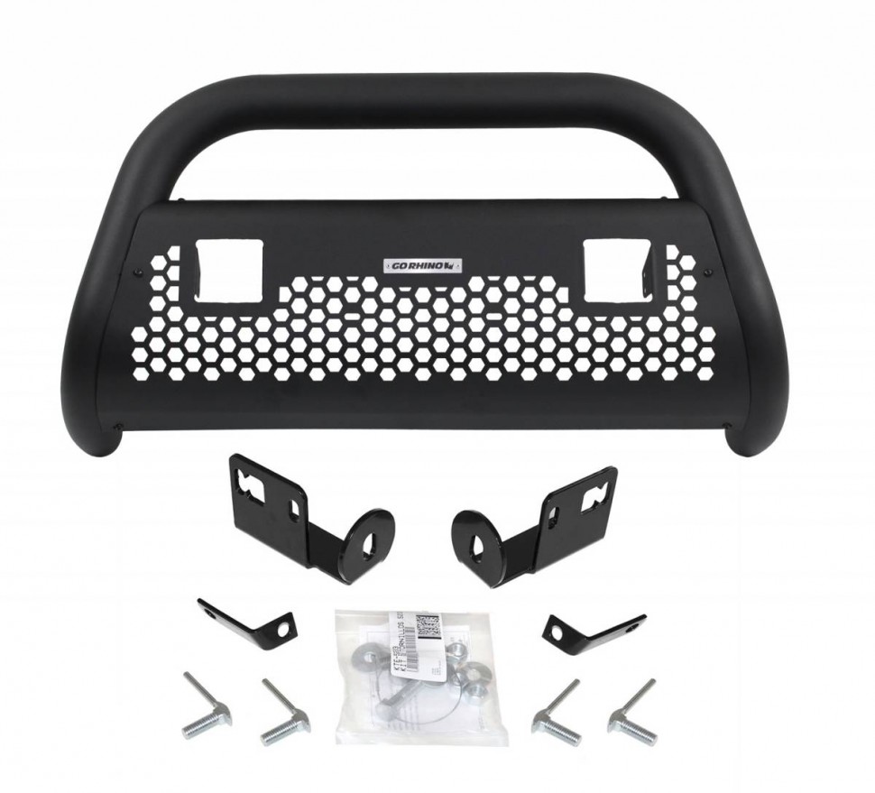 Go Rhino's RC2 LR Bull Bars offer updated styling and the ability to combine today’s popular LED lights with front-end protection. The 3" diameter tubular steel frame features a galvanized steel skid plate with a stylish hexagonal cut out pattern. Different styles are available with light mounts for one 20" single row light bar, two 3" cube lights or four 3" cube lights. In addition, all RC2 LR Bull Bars have pre-drilled light mount holes across the center crossmember. The RC2 LR is available as a standalone; as a kit that includes vehicle-specific mounting brackets; or as a kit that includes both mounting brackets and LED lights. Installation is easy with no drilling required. RC2 LR Bull Bars come with a Limited Lifetime warranty on materials and construction and a 5 year warranty on the Textured Black Finish.