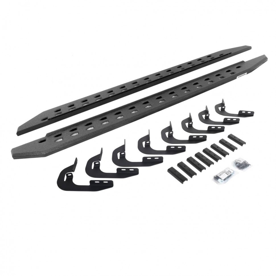 The RB20 Slim Line Running Boards offer the same heavy duty toughness as the original RB Series, but with a slimmer design that fits tighter along the cab for increased ground clearance when off-roading. Constructed from 16-gauge zinc-coated galvanized steel, the Raptor-inspired boards were built to protect your panels from flying debris while providing a full-length step platform. The modern, bullet-stamped design is 5 1/2 inches across at its widest point (compared with 7 1/2 inches of the original RB20) and are offered in cab-length sizes that fit most popular trucks, Jeeps and SUVs. The RB20 Slim Line come with a Limited Lifetime warranty on materials and construction and a 5 year warranty on the Textured Black Finish.