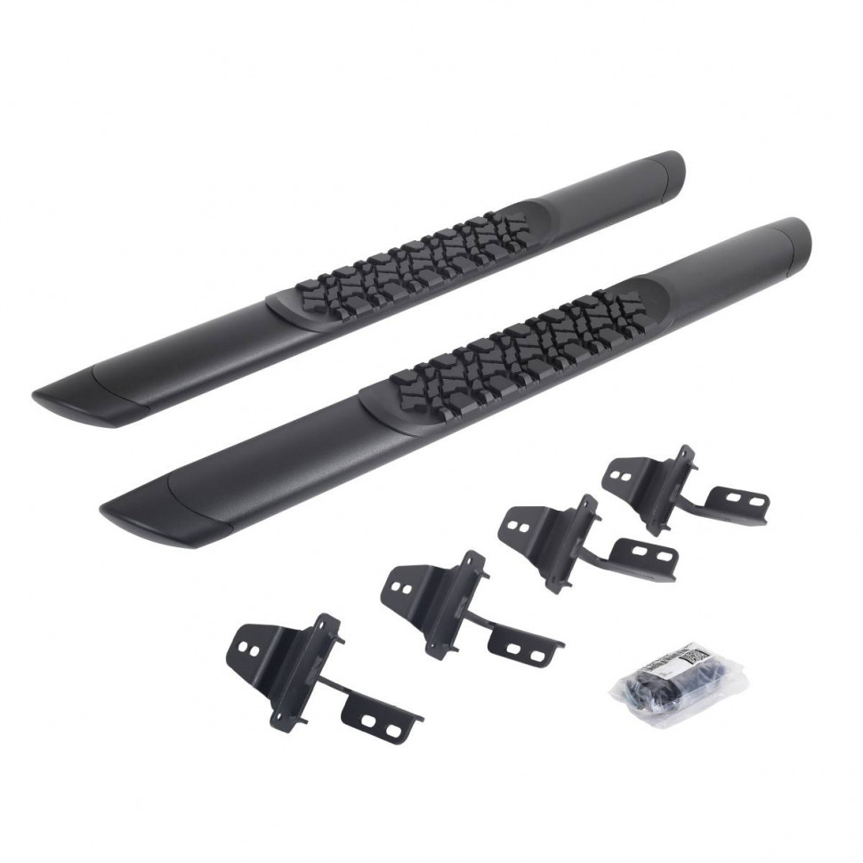 Go Rhino's V3 side steps bring on a sleek, aerodynamic look, the convenience of corrosion-resistant aluminum and strength based on quality engineering and design. Finished with a textured black powder coating, the 5” wide ellipse-shaped boards feature anti-slip polymer step pads with a multi-dimensional tire tread pattern so rain, snow and slush easily drain off and reduce the risk of slipping while stepping up into your vehicle. Each V3 board is fortified with a dual core full length extrusion allowing the board to support up to 300 lbs per step pad (600 lbs per side for 4-door vehicles). Hardware and brackets are included and installation on most vehicles will not require drilling. The V3 Side Steps come with a Limited Lifetime warranty on materials and construction and a 5 year warranty on the Textured Black Finish.