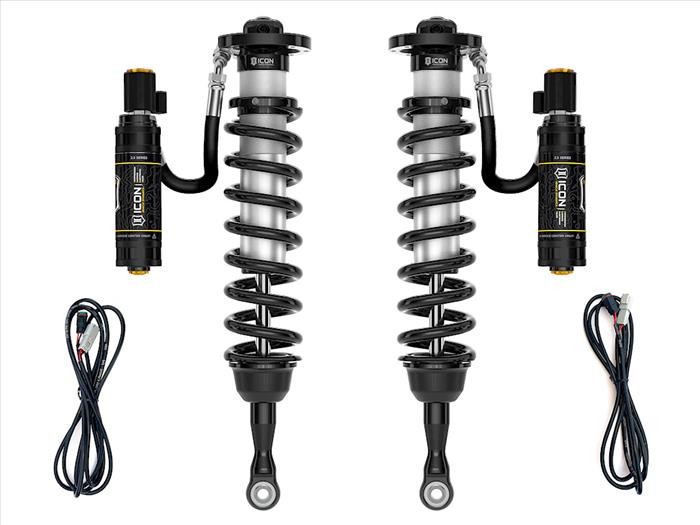 The ICON Vehicle Dynamics V.S. Series 2.5” remote reservoir coilover shocks w/ CDCV are an incredible upgrade for the front end of the 2014-2021 Toyota Tundra. ICON’s Vehicle-specific valving provides a sport tuned feel on and off-road while offering 1-3” of lift height adjustability for use of larger, more aggressive wheel and tire combinations. ICON's larger 2.5” shock body and increased piston area over stock components provides improved damping ability and outstanding ride characteristics across varying types of terrain. Remote reservoirs ensure optimum performance by increasing the duration of consistent damping regardless of situation, keeping the shocks at a cooler operating temperature during heavy use. The ICON CDE Valve upgrade is included for those desiring an easy way to tune the ride electronically from inside the vehicle.