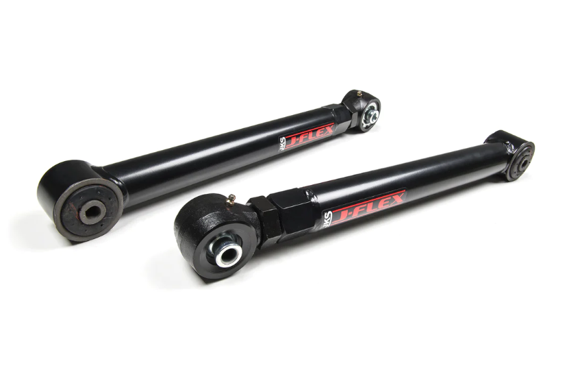 Upgrade your Jeep Wrangler JK’s performance and reliability with JKS J-Flex adjustable rear lower control arms. CNC-bent from stout DOM tubing, the fully adjustable design allows you to fine-tune suspension geometry. The fully adjustable design allows you to fine-tune arm length. The ends are also fully rebuildable and greaseable. With heavy duty 1-1/4"-12 threads and hex shaped weld-in bungs, tightening of the included jam nuts is super easy and secure. At the non-adjustable end, factory style rubber bushings provide quiet, maintenance-free operation. Arms are powder-coated for a long-lasting finish. Sold in pairs.