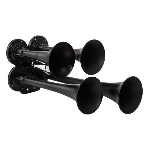 Compact black XCR 2.0™ coated zinc alloy quad train horn with Vortex™ 4 solenoid valve