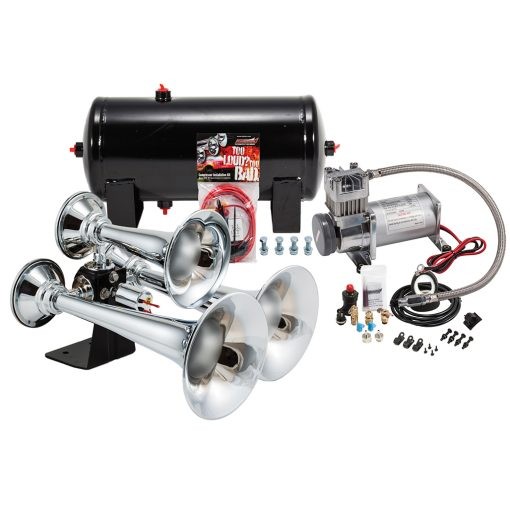 Three tuned trumpets, 16″, 14″, 11″. Chrome plated high impact ABS. There’s no mistaking that genuine train horn sound. When these horns sound you’ll swear that you’re standing on the tracks. The kit includes a 150 PSI compressor and 1.5 gallon air tank.