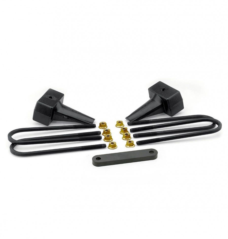 Kit components: One pair of OEM style cast iron rear lift blocks with longer u-bolts and hardware.