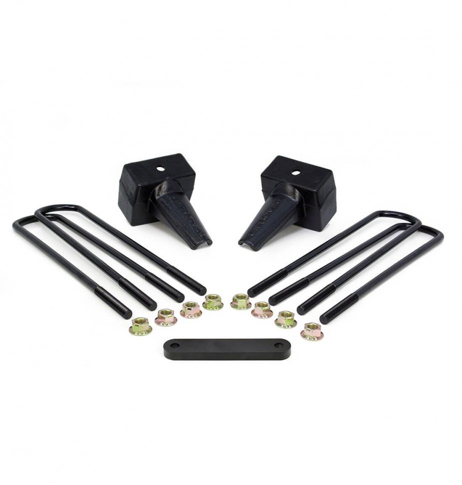 Kit components: One pair of OEM style cast iron rear lift blocks with longer u-bolts and hardware.